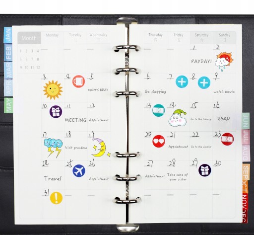 【w zestawie】 segregator A6 * 1 karta tego samego koloru * 12 strona rozdzielająca * 1 torba na suwak * 8 karta z linią poziomą * 45 karta planu miesięcznego * 14 etykieta * 2 wielofunkcyjna naklejka * 3.