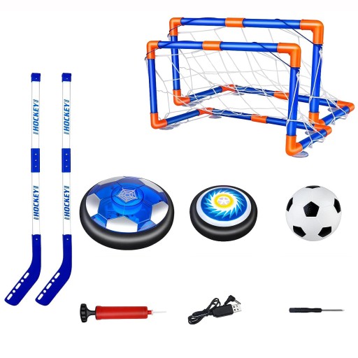 Zawiera 1 ładowalną piłkę nożną, 1 hokej zasilany 3 bateriami AAA (brak w zestawie), 1x nadmuchiwaną piłkę nożną, 2 bramki, 2 kije hokejowe, 1x pompkę powietrza i 1 kabel do ładowania.
