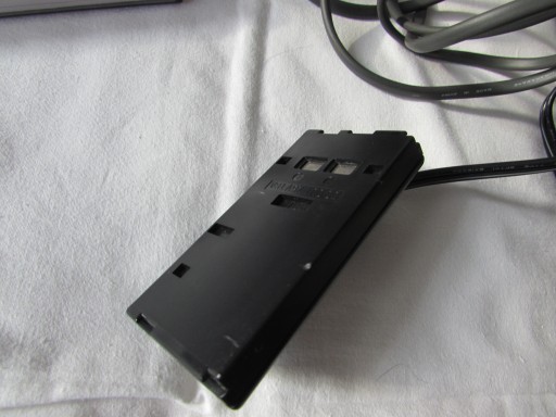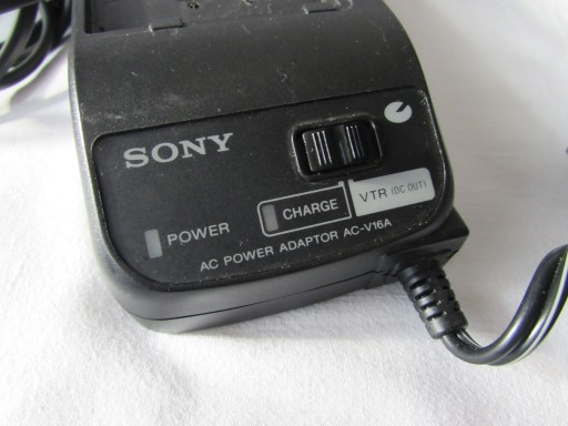 W zestawie oryginalny zasilacz oraz świeżo rozpakowana kaseta Video8. Brak baterii, zasilacz podłącza się w miejsce na baterie.