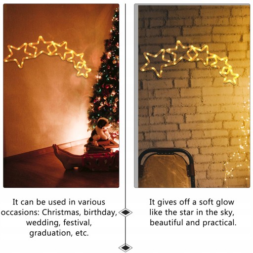 Wykonany z wysokiej jakości materiału, który jest lekki. Wydziela delikatny blask jak gwiazda na niebie, piękny i praktyczny. Zasilany bateryjnie, bardzo wygodny do przenoszenia bez limitu źródła zasilania. Pięcioramienna gwiazda, nie tylko , ale również jako dekoracja Twojego domu, może być wykorzystana przy różnych okazjach: Boże Narodzenie, urodziny, , święta, matury itp.
