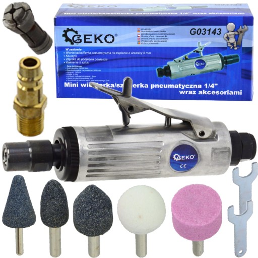 Mini szlifierka trzpieniowa pneumatyczna renomowanej marki GEKO z przyłączem powietrza 1/4". Do szlifierki dołączony został zestaw akcesoriów szlifierskich oraz dwie tuleje 6 i 3 mm. Idealnie sprawdzi się podczas pracy w ciasnych i trudno dostępnych miejscach.