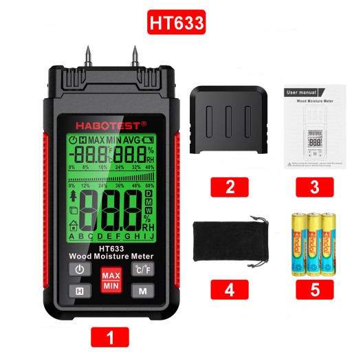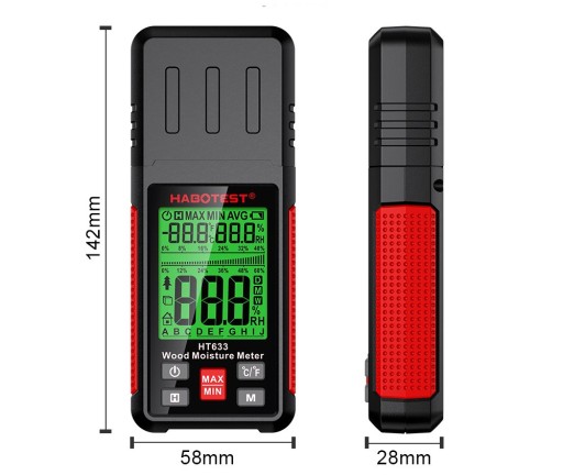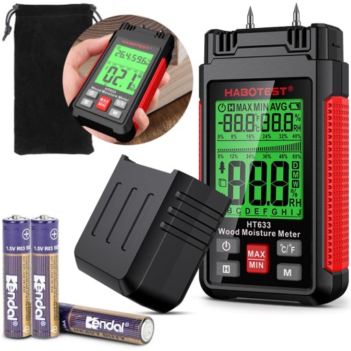 Miernik Habotest HT633 pozwala mierzyć zarówno wilgotność, jak i temperaturę otoczenia. Został wyposażony w 7 trybów pomiaru, które wybiera się w zależności od rodzaju drewna czy materiału. Co więcej, pozwala zmieniać jednostki °C/°F i wyłącza się automatycznie po określonym czasie nieużytkowania, w celu oszczędzania energii (można wyłączyć tę funkcję).