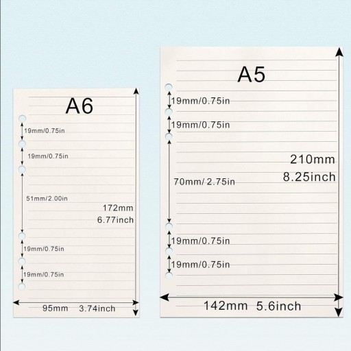 ✅Papier uzupełniający do linii A5: zawartość pudełka: 3 paczki czystych papierów uzupełniających, 45 arkuszy w opakowaniu (270 stron), łącznie 135 arkuszy, wymiary papieru uzupełniającego A5 to (5,6 cala x 8,3 cala), waga 160 g. Odległość między otworami wynosi (0,75 cala / 0,75 cala / 2,75 cala / 0,75 cala) / 0,76 cala.