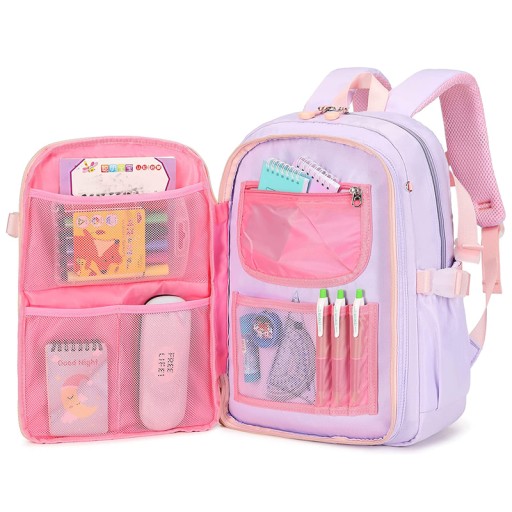 Ten uroczy plecak dla dziewczynek ma 3 przednie kieszenie i 2 główne kieszenie na suwak. i tylna kieszeń antykradzieżowa. 2 boczne kieszenie na parasol i butelkę z wodą. Pierwsza główna kieszeń na suwak może otwierać się o 180 °, co ułatwia organizację codziennych potrzeb szkolnych. Druga główna kieszeń na suwak może pomieścić książki i ubrania, torbę na komputer.