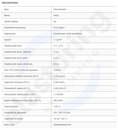 Pasta montażowa miedziana WEICON Copper Paste - specjalna pasta zabezpieczająca do połączeń śrubowych i wszelkiego rodzaju powierzchni ślizgowych. Jest wysokiej jakości materiałem ochronnym i smarnym. Odporna na wysokie temperatury i korozję. Charakteryzuje się dużą przyczepnością do pokrywanego elementu. Nie zawiera siarki, ołowiu i niklu. Zalecana do stosowania na wszelakich narzędziach wtykowych, śrubach, zespołach łączeniowych, itp. Chroni powlekane powierzchnie przed korozją. Redukuje drgania w klockach i prowadnicach hamulcowych, krzywkach i sworzniach hamulcowych, na zaciskach akumulatorów, śrubach i nakrętkach kół oraz tulejach zużywalnych w młotach elektrycznych, pneumatycznych i hydraulicznych.