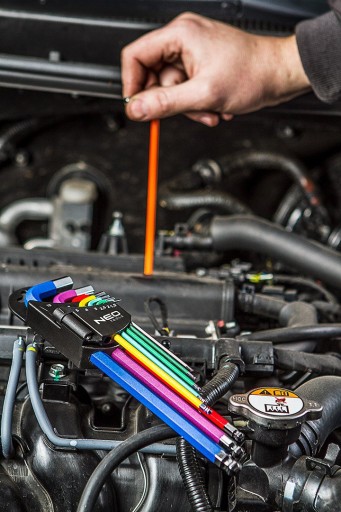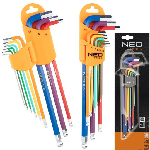 Zestaw kluczy sześciokątnych NEO (nr ref. 09-512) wykonany zgodnie z normą DIN 911. Zestaw zawiera 9 kluczy w rozmiarze od 1.5 do 10 mm w praktycznym opakowaniu. Kuliste końcówki o kącie roboczym do 30° zwiększają funkcjonalność narzędzi. Kolorowy kod ułatwia wybór rozmiaru. Wysokogatunkowa stal stopowa S2 zapewnia długoletnią wytrzymałość kluczy. Certyfikat TÜV, ISO 2936 i 25-letnia gwarancja producenta potwierdzają wysoką jakość narzędzia. Marka NEO spełnia oczekiwania profesjonalistów.