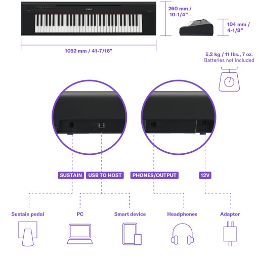 61-klawiszowa klawiatura (konwencjonalne pianino ma 88 klawiszy) jest idealna do grania utworów pop lub prostych utworów klasycznych. Chociaż klawisze mają taki sam kształt jak te na pianinie, klawiatura jest lżejsza, co ułatwia początkującym pianistom rozpoczęcie gry, zamiast cięższego odczucia standardowej klawiatury fortepianu. Możesz także używać słuchawek z NP-15, jeśli obawiasz się, że będziesz przeszkadzać osobom w pobliżu swoją grą.