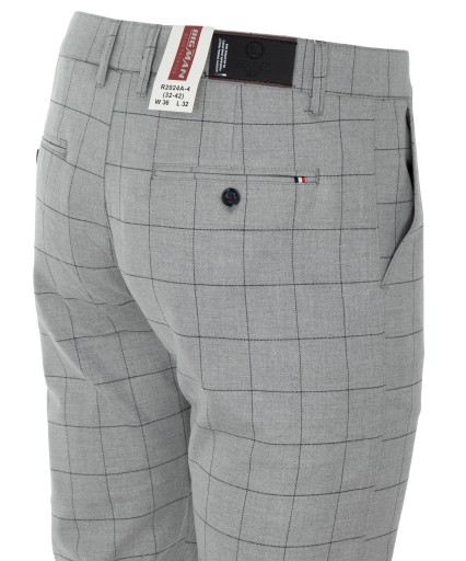 Przedmiotem naszej oferty są spodnie męskie – materiałowe, w kolorze jasno-szarym w ciemną kratkę