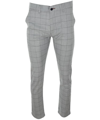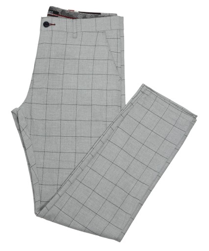 Przedmiotem naszej oferty są spodnie męskie – materiałowe, w kolorze jasno-szarym w ciemną kratkę
