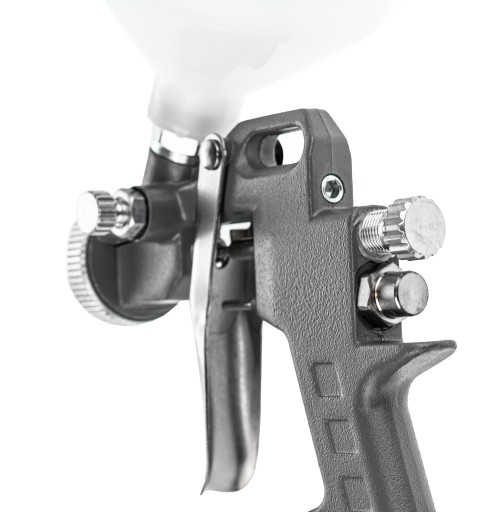 Posiada wytrzymałą dyszę, zbiornik 600ml na ciecz, oraz wszelkie przydatne regulacje - ilości podawanej farby oraz strumienia (szeroki/płaski).
