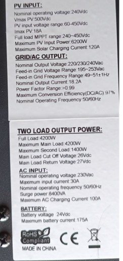 - Drugi kanał wyjsciowy AC max obciązenie 1400W - Np : zasilanie krytyczne budynku( sterowniki pieca, kamery, alarm) Można ustawić ten kanał na niższe napiecie baterii.