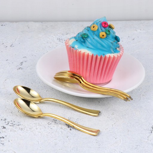 Te jednorazowe łyżki są wykonane z tworzywa sztucznego, co zapewnia sztywność i trwałość. Prosty i elegancki design sprawia, że to naczynie jest odpowiednie dla cukierni. Wygodne i higieniczne, te plastikowe przybory doskonale nadają się również do użytku na imprezach. A złoty kolor wygląda bardziej luksusowo i pasuje do każdego stylu zastawy stołowej!