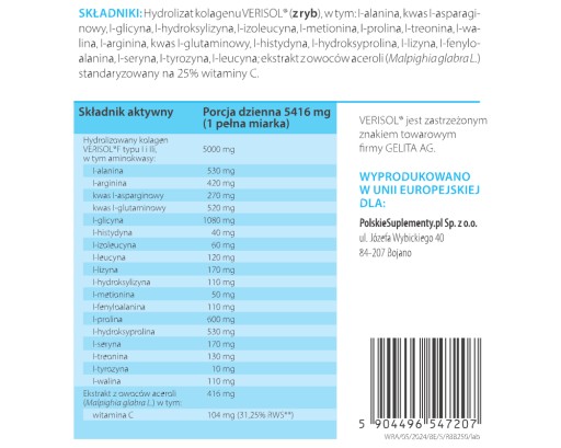 - Skład: Hydrolizat kolagenu VERISOL® (z ryb), w tym: l-alanina, kwas l-asparaginowy, l-glicyna, l-hydroksylizyna, l-izoleucyna, l-metionina, l-prolina, l-treonina, l-walina, l-arginina, kwas l-glutaminowy, l-histydyna, l-hydroksyprolina, l-lizyna, l-fenyloalanina, l-seryna, l-tyrozyna, l-leucyna, ekstrakt z owoców aceroli (Malpighia glabra L.) standaryzowany na 25% witaminy C.