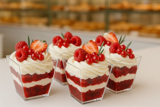 W pojemnikach z łatwością podasz musy, galaretki, tiramisu, sałatki warstwowe, a także zimne przystawki i desery. Klienci chwalą je za uniwersalność, solidność, a także doskonały wygląd na stole, co czyni je niezastąpionymi na weselach, komuniach, imprezach firmowych czy konferencjach.