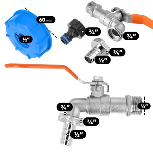 2x Kran Do Zbiornika 1000l IBC MAUZERA NA WĄŻ 1/2x3/4 Zawór Czerpalny Korek