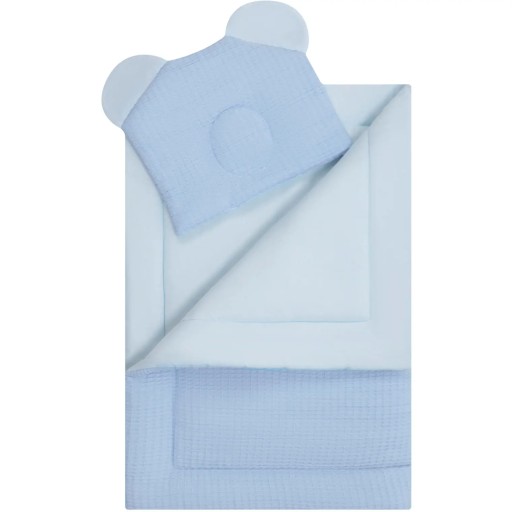 Wykonany z najwyższej jakości artykułów tekstylnych dla dzieci. Komplet ten świetnie sprawdza się w wózkach, kołyskach czy łóżeczkach. Tkanina wafel, nowoczesny design kocyka oraz poduszka miś to świetny wybór dla malucha.