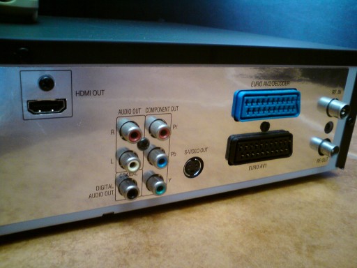 Przede wszystkim ma HDMI, więc można podłączyć pod każdy nowy tv. oprócz tego, 2 x eurozłącze (scart) oraz czincze , s-video, jest też cyfrowe wyjście dźwięku koaksjal,
