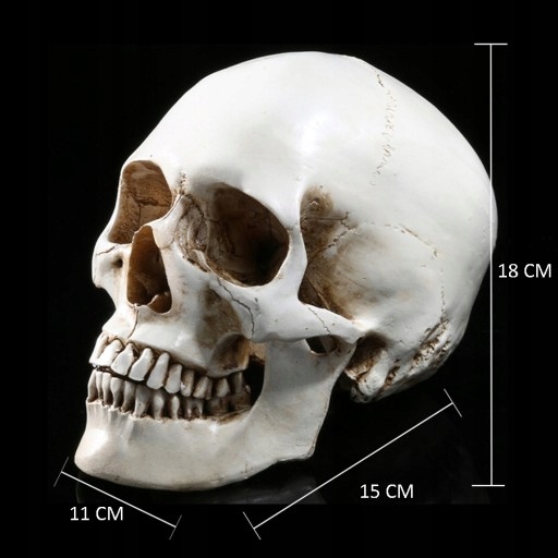 Ten egzemplarz jest repliką modelu ludzkiej czaszki w skali 1: 1. Wykonany jest z wysokiej jakości materiału żywicznego do trwałego użytku. Czaszka doskonale nadaje się do podstawowej demonstracji edukacyjnej w anatomii i nadaje się do śledzenia. Świetna dekoracja i rekwizyt kostiumowy Bal maskowy, kostiumowy, karnawał, Boże Narodzenie, Wielkanoc, Halloween lub inne imprezy.