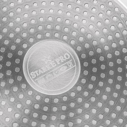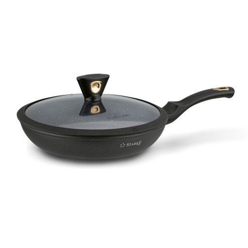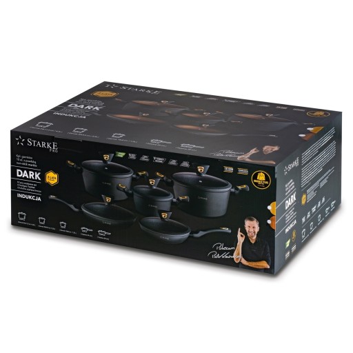 Nieprzywierający komplet garnków na indukcję z pokrywkami Starke Pro Dark Gold 10 elementów jest aluminiowy, ma grube ścianki i chroni jedzenie przed przywieraniem. Rodzaj korpusów, który wykorzystuje, wykuto na gorąco z pojedynczego arkusza metalu techniką forged. Dzięki temu 3 garnki i 2 patelnie – 24 i 28 cm – są bardzo solidne oraz dobrze przewodzą ciepło. Są też świetnie wyważone, co w połączeniu z nienagrzewającymi się i antypoślizgowymi uchwytami soft touch da ci wysoki poziom komfortu użytkowania. Zestaw działa na każdym typie kuchenki, ponieważ korzysta z dna indukcyjnego o grubości 3,2 mm. Sprawia ono, że robienie posiłków jest szybsze, a przy tym energooszczędne. Trwałość powierzchni wewnętrznej naczyń z kolekcji Dark opiera się na trzywarstwowej powłoce marmurowej non-stick MARBLE PLUS (grubość 35-43 mikrometrów). Nie zawiera szkodliwych substancji (np. PFOA), jest twarda, charakteryzuje się doskonałą przyczepnością i naturalną fakturą oraz może znieść do 10 000 cykli ścierania. Ułatwia też pielęgnację (nie do zmywarki, tylko mycie ręczne). W komplecie otrzymujesz również 5 szklanych pokrywek dedykowanych z silikonowymi rantami. Dzięki nim możesz dusić jedzenie i wygodnie regulować ilość pary wodnej wewnątrz garnków lub patelni. Seria Starke Pro Dark Gold z powłoką granitową typu stone była testowana także przez zawodowego szefa kuchni, Piotra Kucharskiego. Poleca on ją do wieloletniego użytku w domowej kuchni.