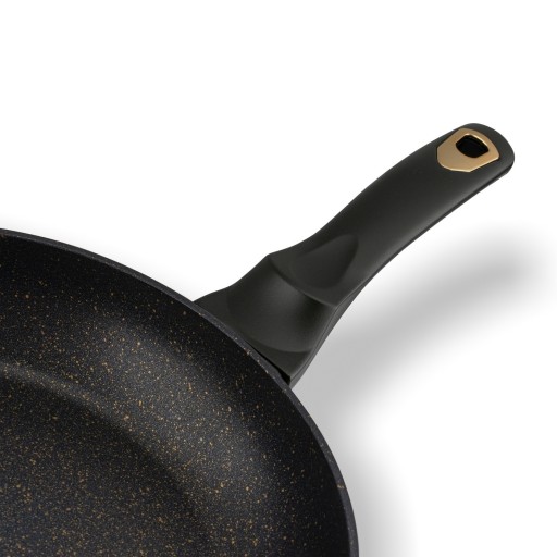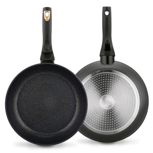 Pozostałe informacje: - garnki i patelnie z kutego aluminium pokryte powłoką Marble Plus posiadającą naturalną chropowatą teksturę o wysokiej przyczepności i doskonałej odporności na ścieranie i zarysowania, -powłoka trzywarstwowa, w kolorze czarnym z błyszczącymi drobinkami, -10 000 cykli ścierania, -grubość dna: 3,2 mm, -grubość ścianki: 2,0 - 2,8 mm, -grubość brzegu: 4 mm, - antypoślizgowe uchwyty soft touch, bakelitowe pokryte powłoką silikonową, -PFOA free, -pokrywa szklana z silikonowym rantem i odpowietrznikiem wykończonym stalą nierdzewną