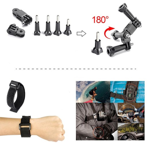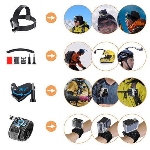 - Ogromny, kompleksowy zestaw uniwersalnych akcesoriów pasujących do większości dostępnych na rynku kamer sportowych