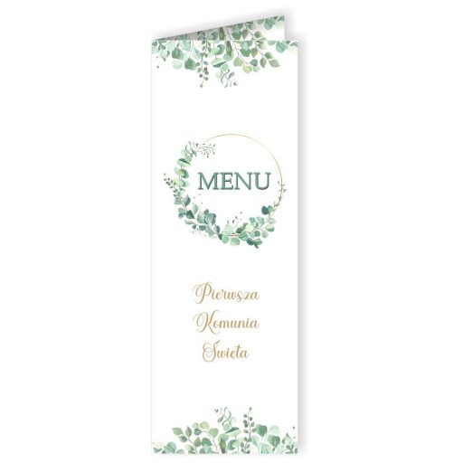 ❤️ Karty mają wysokiej jakości nadruk. Na froncie znajduje się wielki zielony napis Menu oraz złoty napis Pierwsza Komunia Święta, wszystko to w aranżacji listków eukaliptusa - stanowią one świetne dopełnienie kolekcji Eukaliptus Beauty.