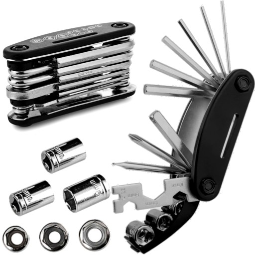 Super przydatny zestawy kluczy rowerowych i nie tylko! Dzięki multikluczowi wykonasz wszystkie niezbędne naprawy roweru bez przewożenia ze sobą ciężkich zestawów narzędzi. Zestaw jest bardzo praktyczny i zajmuje mało miejsca. Multitool posiada 16 różnych narzędzi, które służą do pracy przy rowerze i nie tylko. Zaletą zestawu jest jego multifunkcjonalność! Przedmiot świetnie spisze się jako codzienne narzędzie pracy do mniejszych robótek lub na co dzień w domu. Po złożeniu bez problemu mieści się w kieszeni i nie zajmuje dużo miejsca w torbie rowerowej lub bagażowej. W zestawie znajdują się klucze imbusowe, wkrętaki, nasadki wraz z adapterem, a także klucze płaskie oraz specjalny klucz do szprych 14GE.ści się w kieszeni i jest łatwy w przechowywaniu!