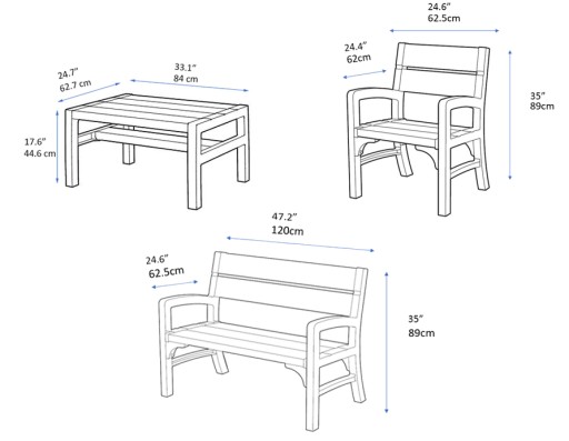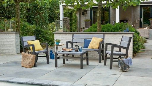 Tworzywo z jakiego zostały wykonane meble jest w 100% odporne na wilgoć i promieniowanie UV. Nie ma obaw, że zestaw zmieni kolor lub wyblaknie. Meble mogą stać na zewnątrz przez cały rok. Należy zabezpieczyć jedynie poduszki.