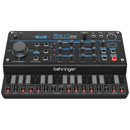 Behringer PRO VS MINI – przenośny, czterogłosowy syntezator hybrydowy, wyposażony w czterokierunkowe oscylatory kształtujące, analogowy filtr dolnoprzepustowy, 16-krokowy sekwencer oraz arpeggiator.
