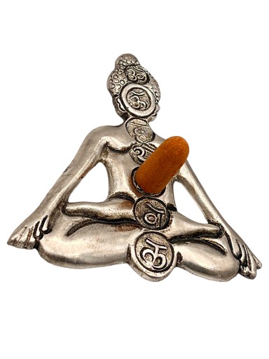 Odkryj niezwykłą podstawkę do wypalania kadzideł w kształcie Buddy, wykonaną z metalu w srebrnym kolorze i zdobioną siedmioma czakramami.