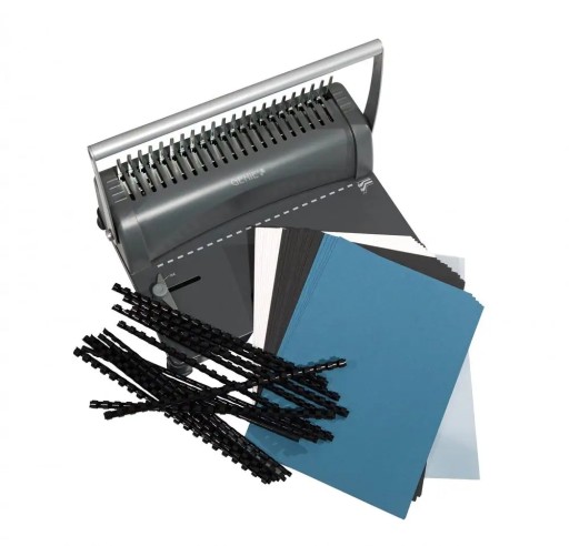 Ta niezwykle łatwa w obsłudze bindownica umożliwia stworzenie w szybki sposób atrakcyjnej oprawy dokumentów A4 przy pomocy spirali i kolorowych okładek dołączonych do zestawu.