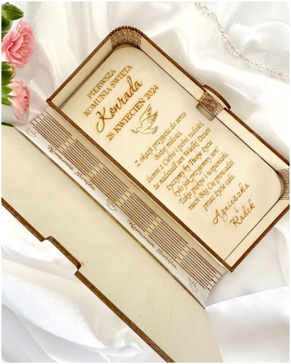 W otwieranym pudełeczku znajduje się kartka z personalizowanymi życzeniami do którego dodatkowo możesz włożyć biżuterię, pamiątkę Pierwszej Komunii lub pieniądze.