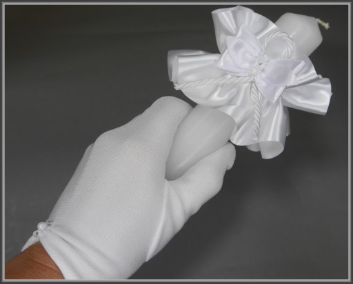 Torebka komunijna w kształcie woreczka wykonana z satyny ślubnej wysokogatunkowej ozdobiona uroczą kokardką z naszytymi koralikami. Torebka posiada usztywnianą wkładkę pomagającą zachować jej kształt nawet po obciążeniu. Na pozostałych aukcjach można do niej dobrać np. okapnik na świecę czy rękawiczki.