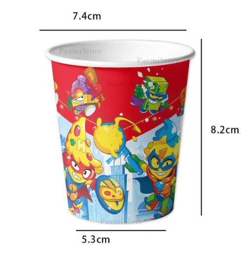 - zestaw: 10 sztuk kubeczków papierowych + 10 szt. talerzyków papierowych + 20 sztuk serwetek z bohaterami Super Things Zings