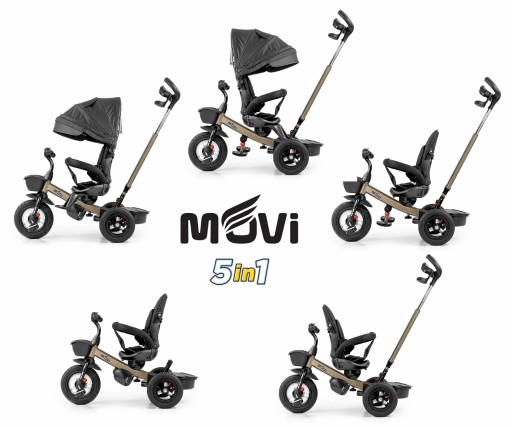 MOVI jest stabilny i bezpieczny, posiada nowoczesną konstrukcję, wygodne wyprofilowane obracane o 360 stopni siedzisko, które umożliwi podróż przodem lub tyłem do kierunku jazdy. Rowerek został wyposażony w barierkę zabezpieczająca dziecko przed wypadnięciem, trzypunktowe pasy bezpieczeństwa oraz podnóżki a pompowane koła umożliwiają cichą i komfortową jazdę. Po zdemontowaniu rączki, barierek, budki i pokrowca na siedzisko MOVI będzie służył jako rowerek trójkołowy. Dzięki funkcji „wolnego koła” dziecko może swobodnie pedałować, a kierownica dla rodzica nadal może korygować prędkość przemieszczania. Połączenie metalowej konstrukcji, pompowanych kół oraz elementów wykonanych z wysokiej jakości tworzyw sztucznych, daje gwarancję wytrzymałości.