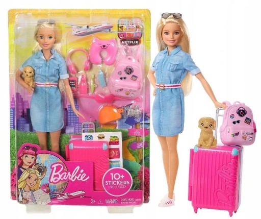 Barbie Dreamhouse Adventures Barbie w podróżyBarbie może zabrać ze sobą szczeniaczka i młode marzycielki w podróż dookoła świata z tym wyjątkowym podróżniczym zestawem. Zestaw inspirowany serialem Barbie Dreamhouse Adventures zawiera zabawne, kolorowe elementy, które pobudzają wyobraźnię zajrzyj w codzienne życie Barbie, gdy wyrusza na ekscytujące przygody z rodziną i przyjaciółmi! Lalka Barbie ma ze sobą ukochanego szczeniaczka jako towarzysza podróży i różową walizkę, która otwiera się i zamyka jest nawet wyposażona w wysuwany uchwyt, tak jak prawdziwy bagaż! Ponadto, zestaw podróżny zawiera arkusz naklejek, które można wykorzystać do udekorowania walizki i udokumentowania podróży.