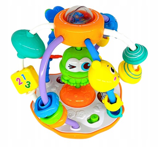Urocza żabka mruga radośnie, śliczna kuleczka z koralikami do obracania, maleńkie bezpieczne lusterko kusi nieśmiało, a do tego wesołe dźwięki zwierzątek, melodyjki, kolory i światełka!