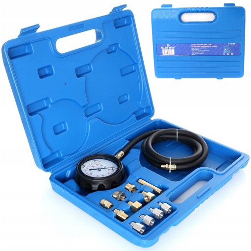 Zestaw do kontroli ciśnienia w układzie olejowym silników. Umożliwia wczesne odkrycie usterki pompy oleju lub zanieczyszczonych kanałków oleju. Może to oznaczać obniżenie kosztów remontu generalnego zatartego silnika. Komplet w poręcznej walizie,pasuje do większości silników. Można go stosować zarówno w silnikach benzynowych,diesla. Zestaw wielu adapterów pozwoli na dobranie odpowiedniej końcówki. Manometr posiada gumowa osłonę co chroni go przed uszkodzeniem po upadku. Tester posiada długi elastyczny wąż.