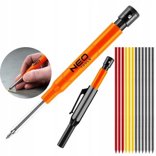 Ołówek, rysik automatyczny z temperówką plus 12 wkładów 13-816 NEO to narzędzie przeznaczone do wszelkiego rodzaju oznaczania powierzchni. Umożliwia wygodne zaznaczenie punktu wiercenia lub cięcia na drewnie, płaszczyźnie drewnopodobnej, papierze, metalu, kamieniu czy szkle. Wykonany w gustownym czarno-pomarańczowym kolorze nawiązuje do logo marki NEO.