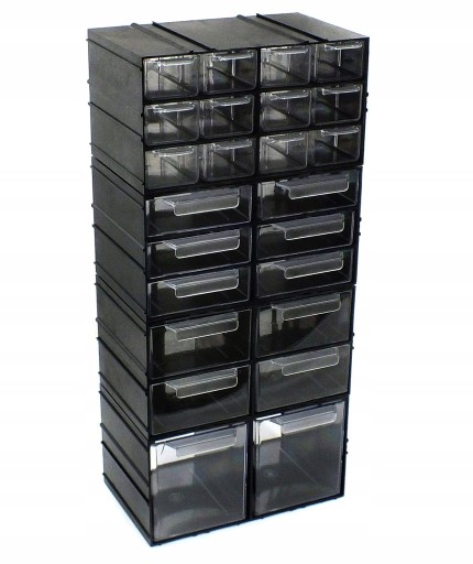 Modułowy system szufladek pozwalający budować zestawy, ścianki, złożone z różnych wielkości szufladek. Obudowa wykonana z polistyrenu ma zawsze ten sam wymiar zewnętrzny. System rowków pozwala łączyć moduły miedzy sobą. Wnętrze jest podzielone tak że można w nie włożyć jedną, dwie, cztery, sześć lub dwanaście szufladek.