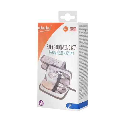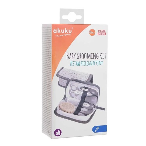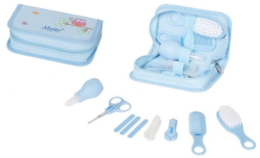 Zestaw do pielęgnacji Twojego dziecka w wygodnej i praktycznej kosmetyczce. Nożyczki (o cienkich metalowych ostrzach i zaokrąglonych krawędziach) oraz cążki pomogą pewnie i bezpiecznie obciąć paznokcie, a pilniczek z łatwością usunie nierówności paznokcia chroniąc dziecko przed zadrapaniem. Miękka szczotka z naturalnego włosia oraz grzebyk z antypoślizgowym uchwytem zatroszczą się o główkę Twojego maleństwa. Gruszka zakończona miękką końcówką przeznaczona jest do udrażniania dróg oddechowych oraz usuwania wody i woskowiny z uszu niemowlaka.