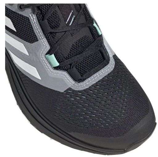 Adidas Terrex zapewnia stabilny krok na różnych podłożach, a tym samym zwiększa bezpieczeństwo . Siateczkową cholewkę wzmacniają syntetyczne elementy, dbając o lepszą stabilizację stopy. Wyściełane wnętrze chroni przed otarciami i zwiększa komfort użytkowania. Podeszwa z pianki EVA i gumy doskonale radzi sobie z amortyzacją wstrząsów i nadaje korkom sprężystości. Mocno wypukły bieżnik podeszwy Traxion doskonale trzyma się zarówno na płaskich, jak i nierównych nawierzchni.