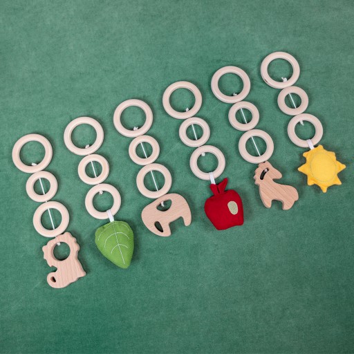 ✔ zawiera atrakcyjne zawieszki: 3 szeleszczące, kolorowe i 3 drewniane zwierzaczki.
