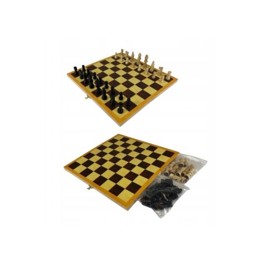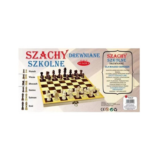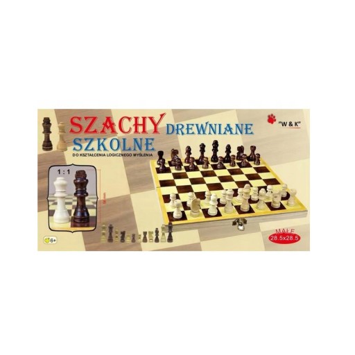 Małe szachy szkolne wykonane z drewna. Wymiary: 285 x 285 mm.