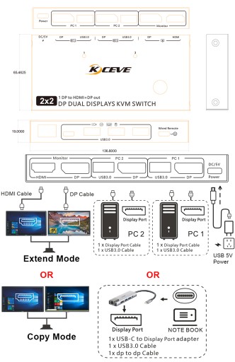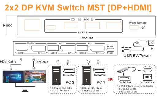 Funkcja: Przełącznik DP KVM 2 wejścia 2 wyjścia z MST