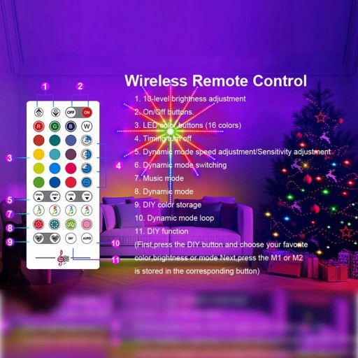 Elastyczne 40keys IRs kontroler tak, że można cieszyć się 10 poziomów dimmable / 16 statycznych kolorów zmieniających się / 30mins & 60mins &90mins &120mins 4 poziomy timer / różne tryby dynamiczne oświetlenie / muzyka synic, po prostu cieszyć się jego wspaniałe kolorowe efekty bez czasu i ograniczenia przestrzeni.