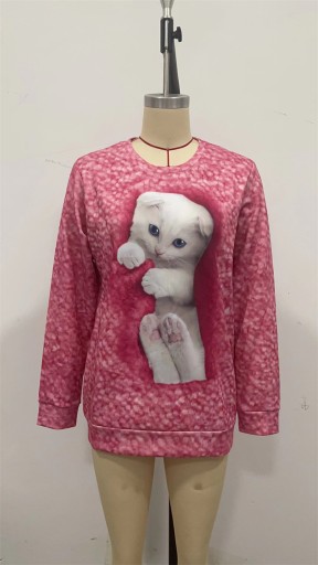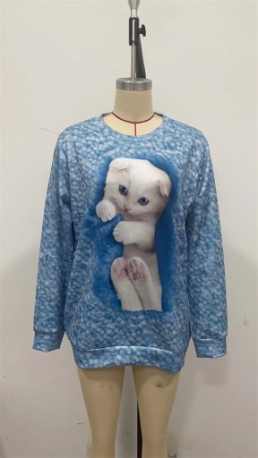 - Damska bluza z długim rękawem Cute Cat 3D Printing Tops Crew Neck Animal Puppy Dres