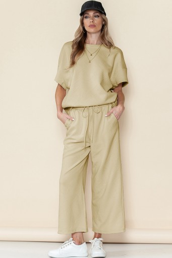 Ten modny komplet składa się z luźnej bluzki i spodni z elastycznym ściągaczem w pasie. Wykonany jest z miękkiego i delikatnego materiału, który zapewnia niezrównany komfort noszenia. Nie tylko prezentuje się świetnie, ale także wysmukla sylwetkę i dyskretnie maskuje niedoskonałości. 🌟