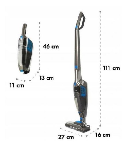 Wymiary odkurzacza ręcznego: ok. 11 x 13 x 46 cm (szer. x wys. x gł.)