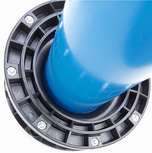 Na skutek dokręcenia śrub następuje dopasowanie uszczelki, będącej elementem głowicy, do rury studziennej. Dzięki temu rozwiązaniu mamy pewność, że połączenie pomiędzy głowicą, a rurą jest szczelne i głowica jest solidnie zamocowana na rurze studziennej.